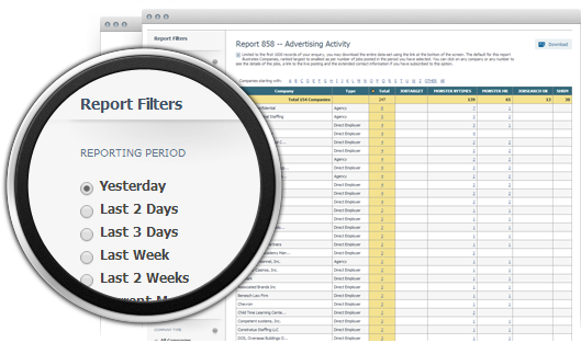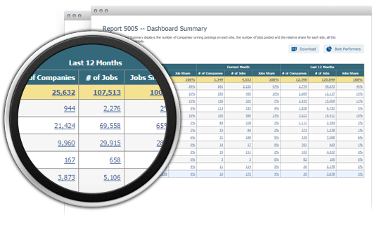A single click takes you behind any number to a list of companies posting jobs. You can view activity from one site or all sites.