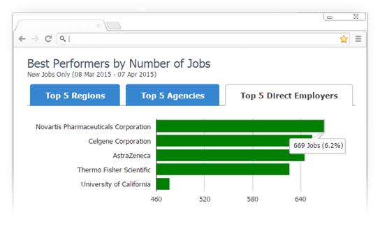 From the Dashboard Summary, click on the 'Best Performers' and you'll see the highest placement of jobs in metrics such as Region, Recruitment Agencies and Direct Employers. Hover over the bar associated with any metric and you see the job posting details. Click the bar and you will link to a list of all the company activity by the job boards they used.